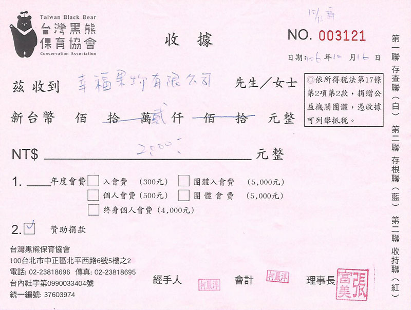 幸福果舖x台灣黑熊保育協會 一塊做公益104-105年度(2015-2016)活動捐贈
